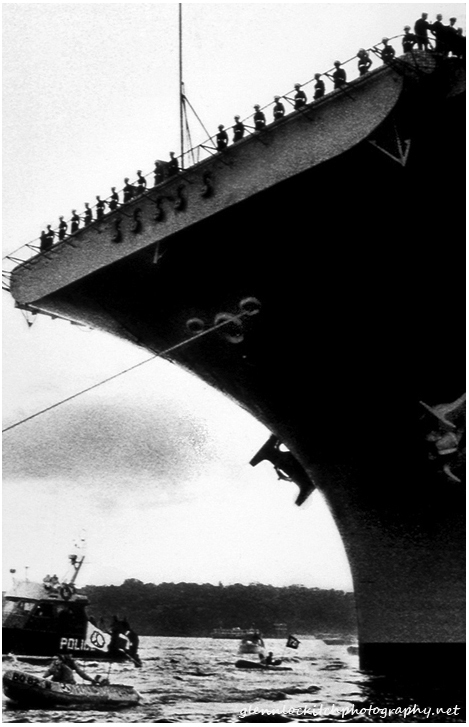 Sydney Peace Squadron confront US aircraft carrier protesting against US warships carrying nuclear material.