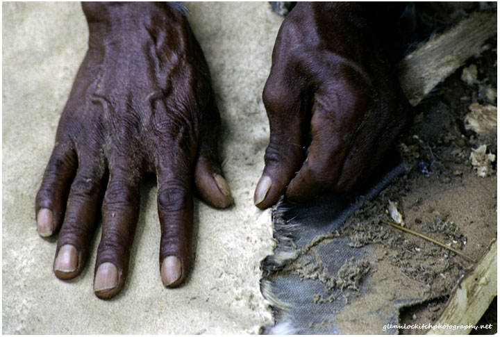 PHOTOS » A Kalahari Bushman Prepares Animal Skin for Leather Clothing, Kadwane Refugee Camp, Central Kalahari Game Reserve, Botswana 2006.