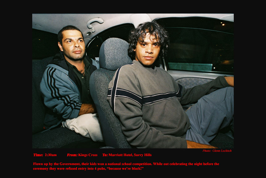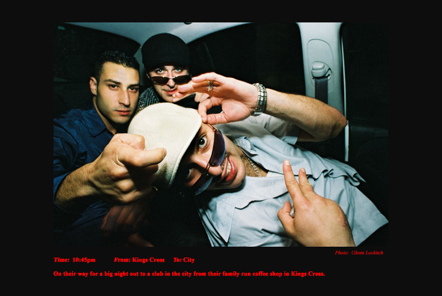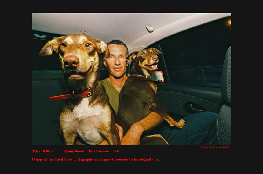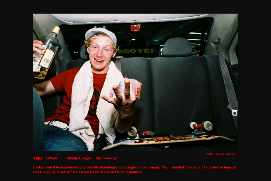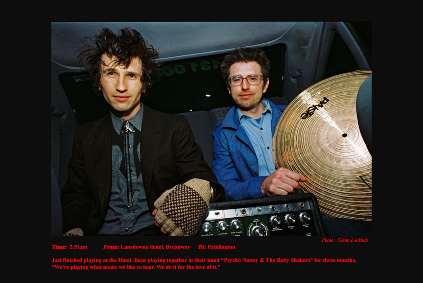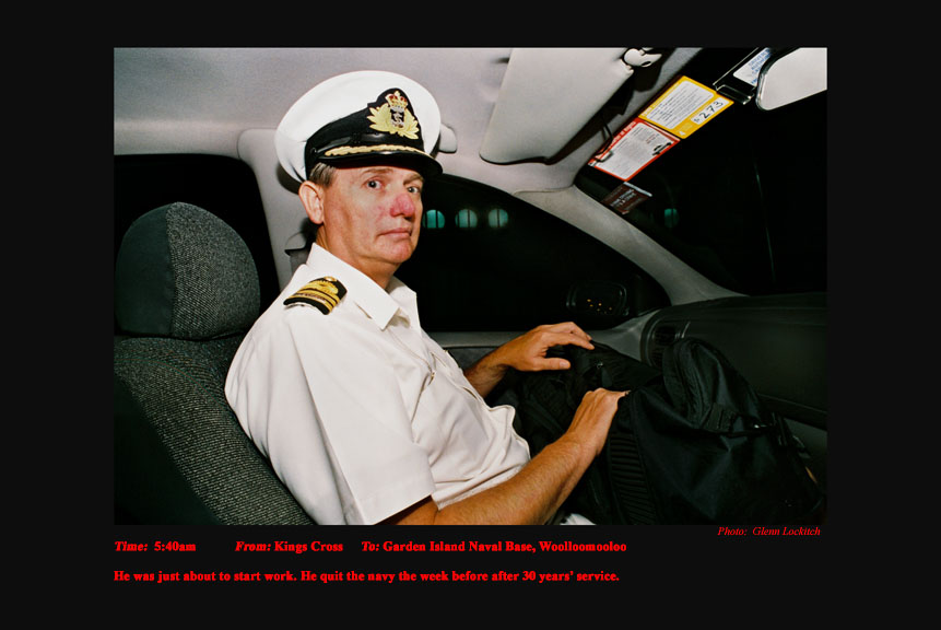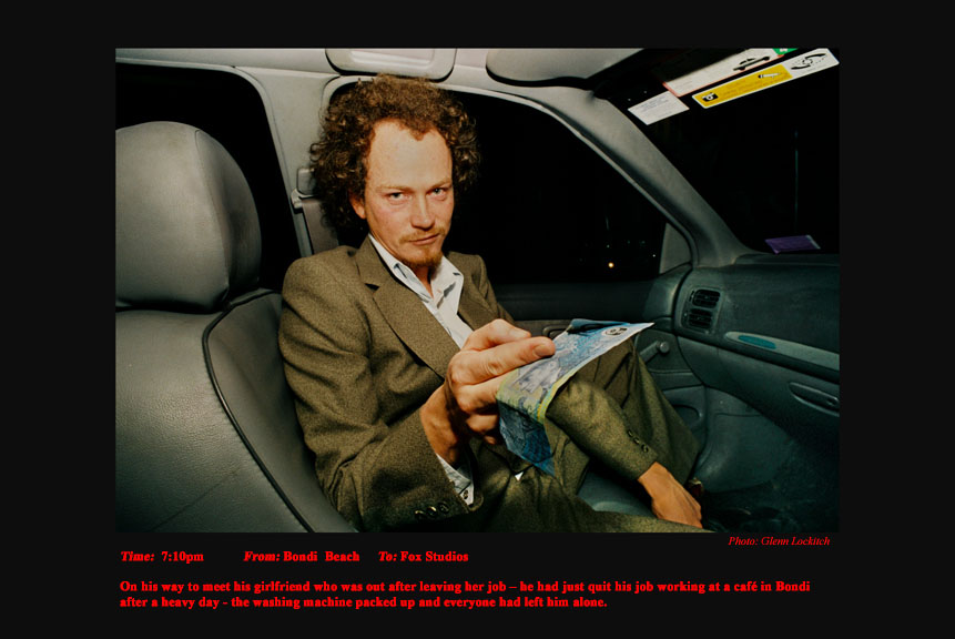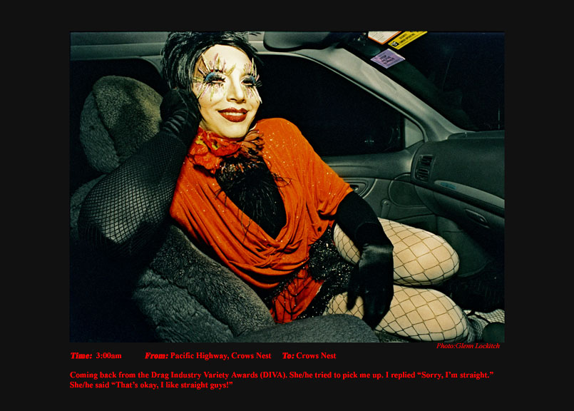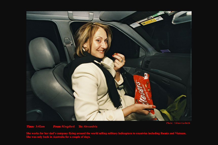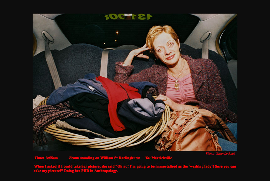 To support my independence in my photojournalism I drove a Sydney taxi for 15 years. For the last six years I photographed and documented my passengers. I drove at night between sunset and sunrise. I documented the pick-up time, location and destination of each passenger I photographed. On the journey I conversed a little about their lives and their reasons for catching my taxi. A twelve-hour taxi shift presents and telescopes a variety of characters and situations that would normally be experienced over a much longer period of time in every-day life.